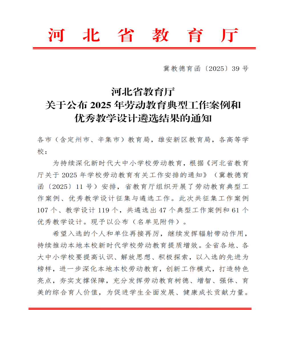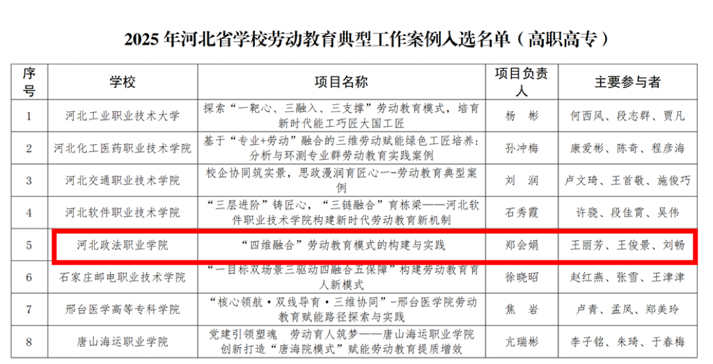 近日,河北省教育厅公布2025年劳动教育典型工作案例遴选结果,我校《“四维融合”劳动教育模式的构建与实践》案例,在全省107个案例中脱颖而出,成功入选全省高职高专院校劳动教育典型案例。