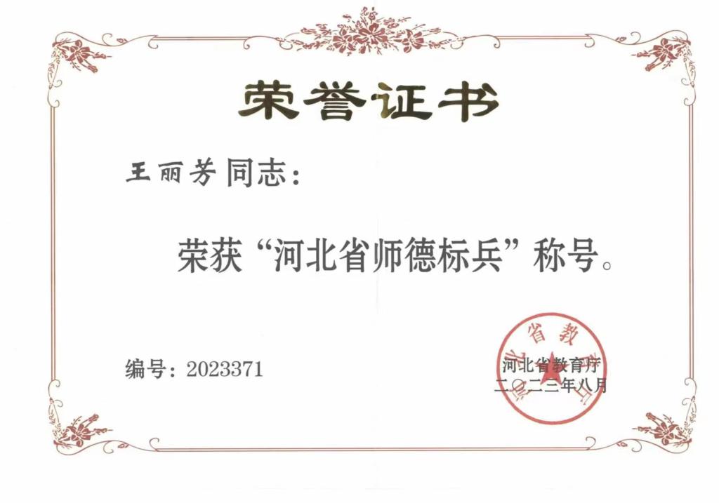 基础部老师王丽芳荣获2023年“河北省师德标兵”称号。